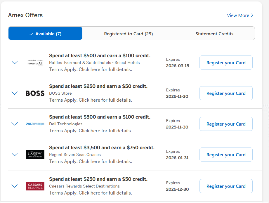 These offers are not applied automatically to your card, you need to resgiter for them in your Amex® account. If you have more than one Amex® card, an offer may show up on one card but not another, so it’s always worth checking all of them.
